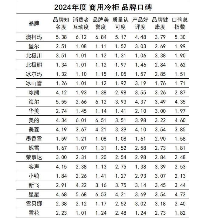 口碑总指数方面,与上期相比,新入榜品牌有堡尔、北极川、北极熊、冰尔玛、冰山雪、墨香雪、妮雪;落榜品牌有艾豪思、德玛仕、格盾、海信、来博、乐创、穗凌。澳柯玛、星星、美的位居前三。澳柯玛、星星、美的、海尔、美菱、新飞、容声、荣事达在近两期中均位居前十。冰熊、雪贝娜在本期晋升至前十。